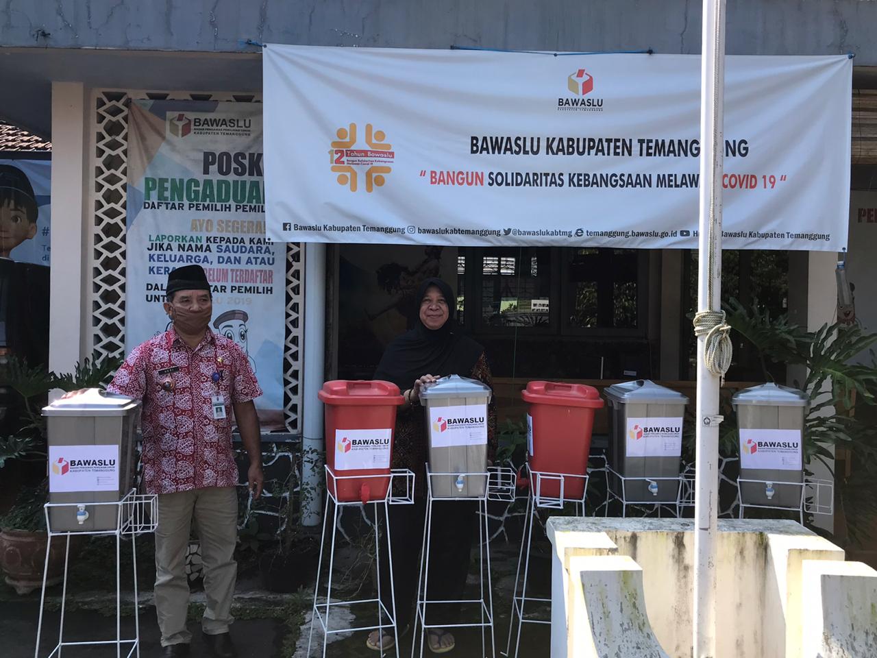 Humas Bawaslu Kabupaten Temanggung. Kamis, 30 April 2020 sebagai kelanjutan peringatan Hari Jadi Bawaslu ke 12, Bawaslu Kabupaten Temanggung menyerahkan 6 buah tempat air pencuci tangan kepada Kepala Kelurahan Temanggung 1, Kecamatan Temanggung, Kabupaten Temanggung. Penyerahan barang beserta berita acaranya dilakukan di halaman kantor Bawaslu Kabupaten Temanggung. Menurut informasi dari Erwin, Ketua Bawaslu Kabupaten Temanggung, pengadaan tempat air pencuci tangan tersebut bersumber dari donasi yang dihimpun dari komisioner dan staf Bawaslu Kabupaten Temanggung. Adapun barang tersebut akan dipasang di beberapa pintu masuk gang di lingkungan Kelurahan Temanggung 1, agar warga mudah membiasakan diri mencuci tangan sebelum sampai di rumah masing-masing. Kemudian mengenai sasaran penyerahan kepada Kelurahan Temanggung 1 juga sebagai salah satu bentuk bina lingkungan dimana kantor Bawaslu Kabupaten Temanggung berada.