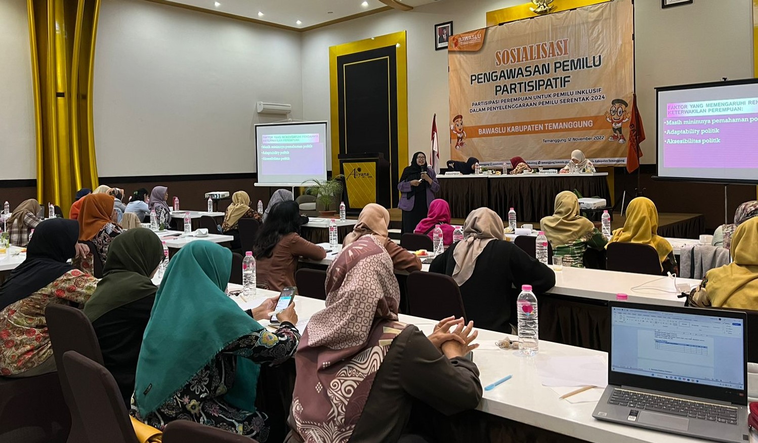 Humas Bawaslu Temanggung-TEMANGGUNG. Badan Pengawas Pemilu (Bawaslu) Kabupaten Temanggung hari ini menggelar sosialisasi pengawasan pemilu partisipatif dengan tema partisipasi perempuan untuk pemilu inklusif dalam penyelenggaraan pemilu serentak tahun 2024. Sosialisasi ini bertujuan mendorong kesetaraan gender dalam berdemokrasi di Indonesia.