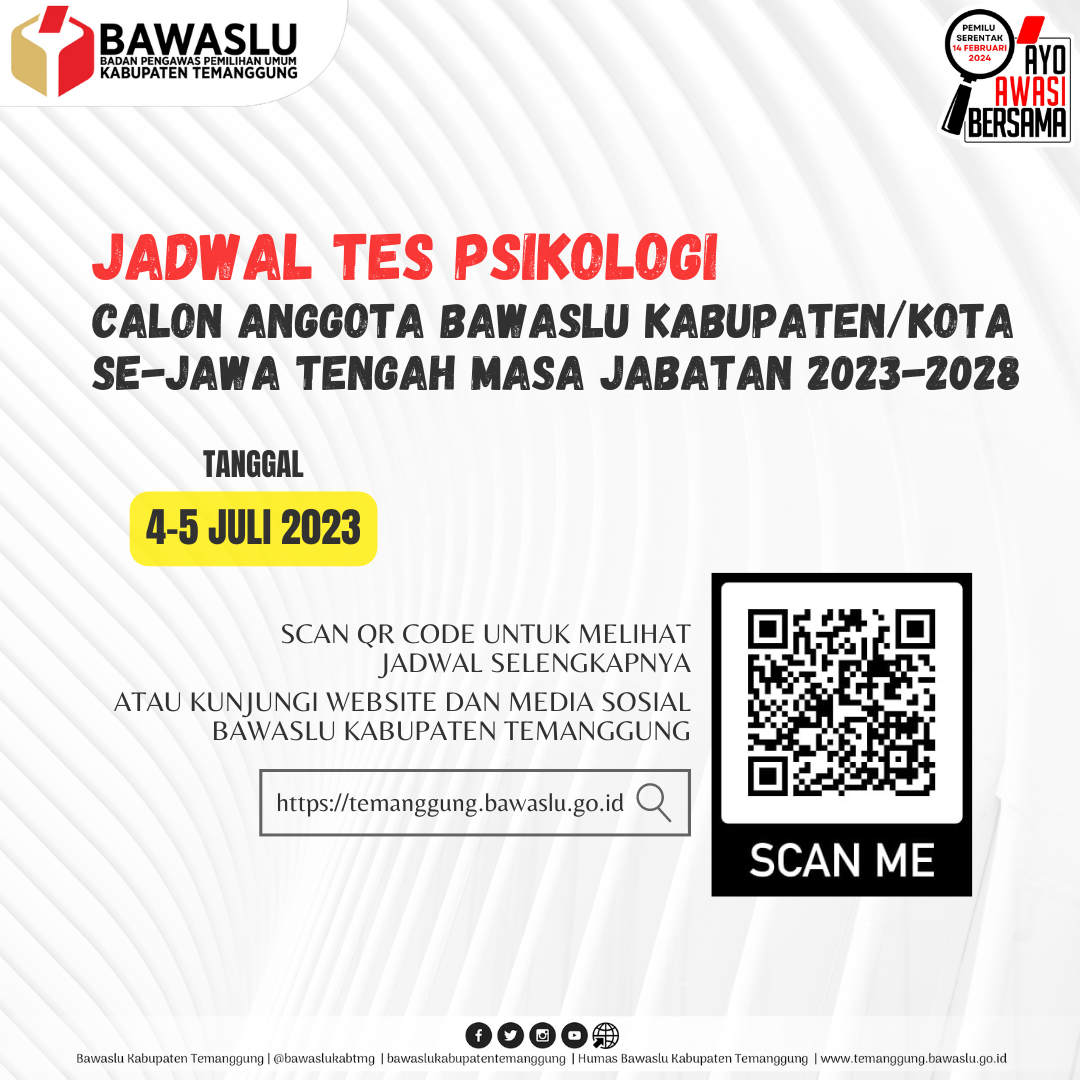 Menindaklanjuti Pengumuman Hasil Penelitian Berkas Administrasi Calon Anggota Bawaslu Provinsi Jawa Tengah Nomor 18/TIMSEL-V.JTG/06/2023 tanggal 22 Juni 2023, Tes Psikologi akan dilaksanakan pada waktu dan tempat terlampir. Selengkapnya klik disini