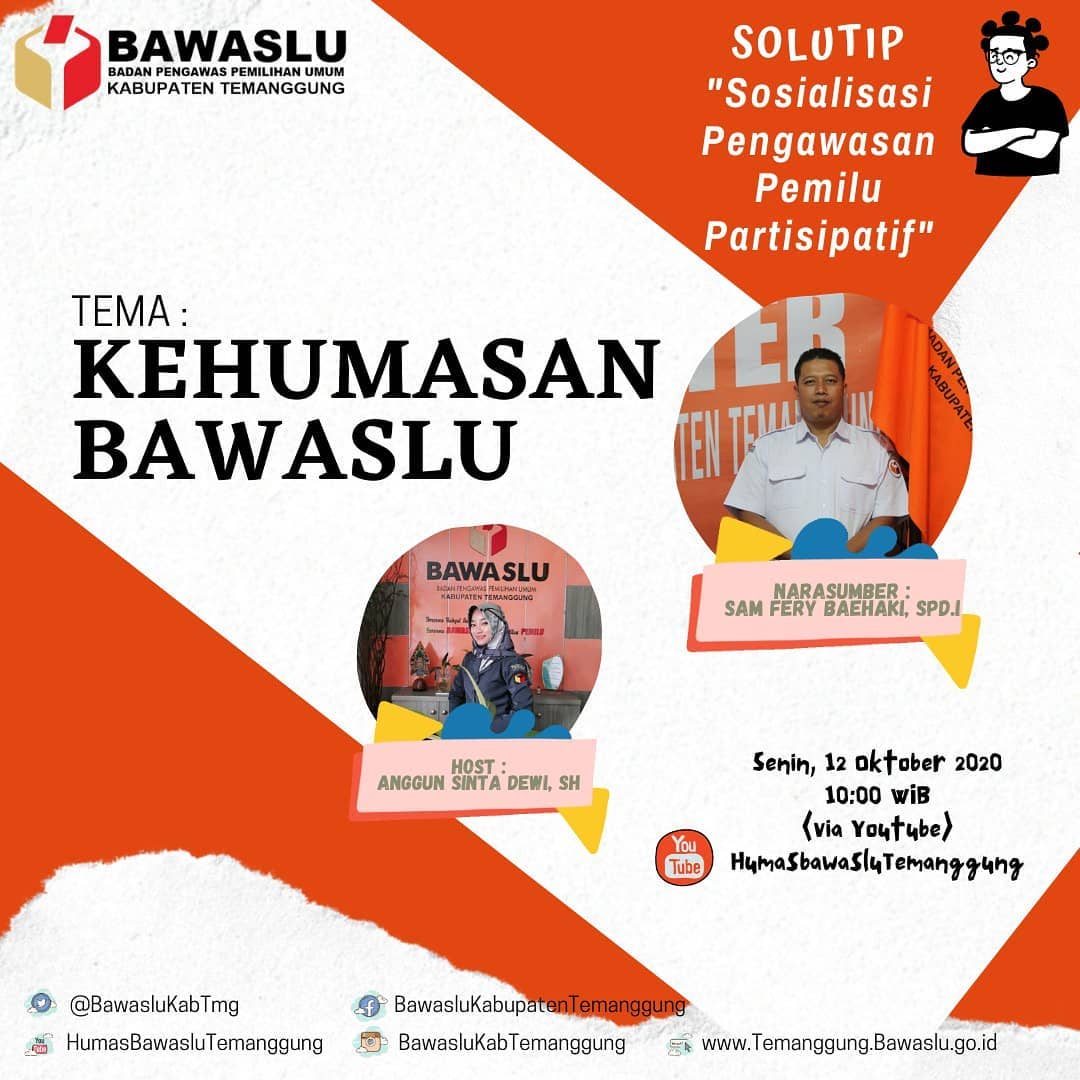 Solutip ini akan diselenggrakan secara berkala dengan nara sumber dari semua anggota dan sekretariat Bawaslu Temanggung serta mengambil tema yang berbeda-beda seperti demokrasi, sejarah dan penyelenggaraan pemilu, penegakkan hukumnya , hasil-hasil pengawasan atau pengawasan partisipatif dan sebagainya, diskusi ini akan ditayangkan melalui akun you tube resmi Bawaslu Temanggung dengan alamat Humas Bawaslu Temanggung”.